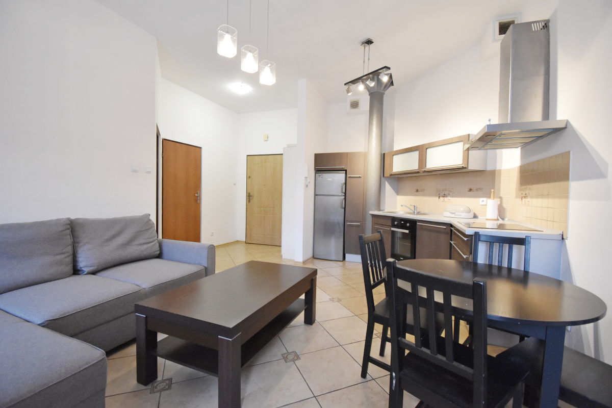 Mieszkanie składa się z salonu z aneksem kuchennym, sypialni, łazienki z kabiną prysznicową oraz przedpokoju. Do dyspozycji najemcy naziemne miejsce postojowe zlokalizowane przy budynku.