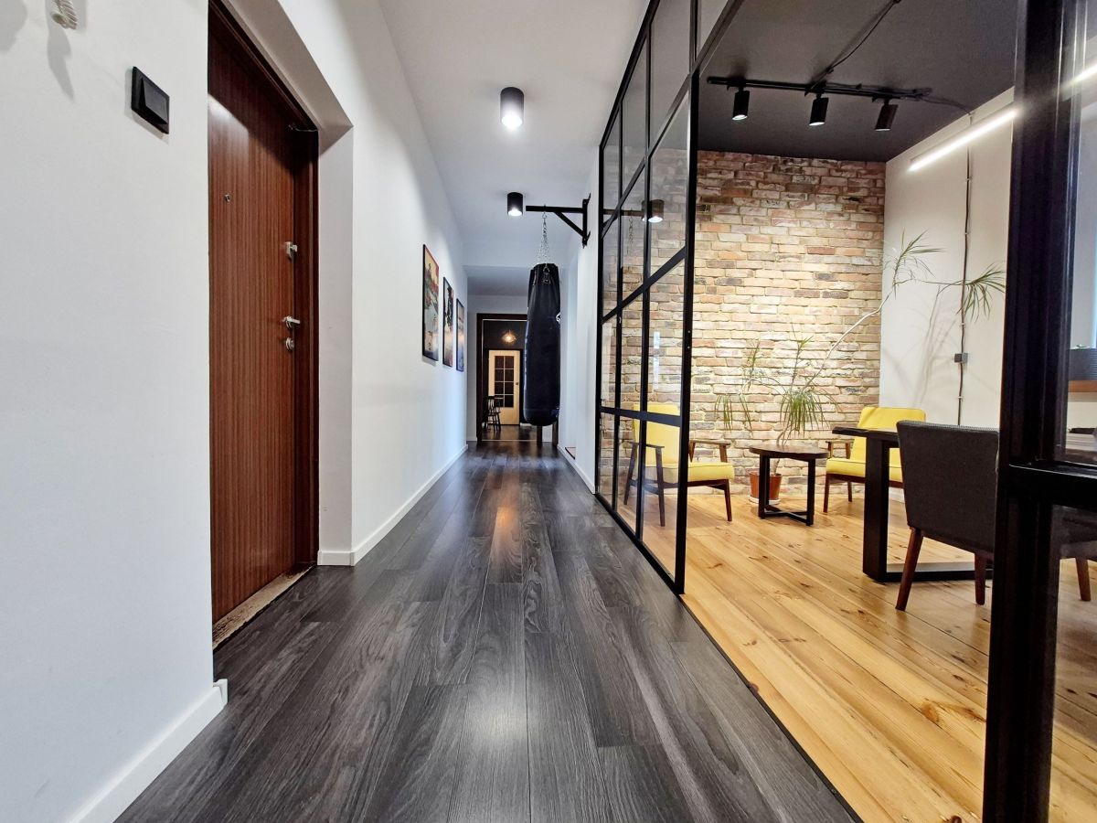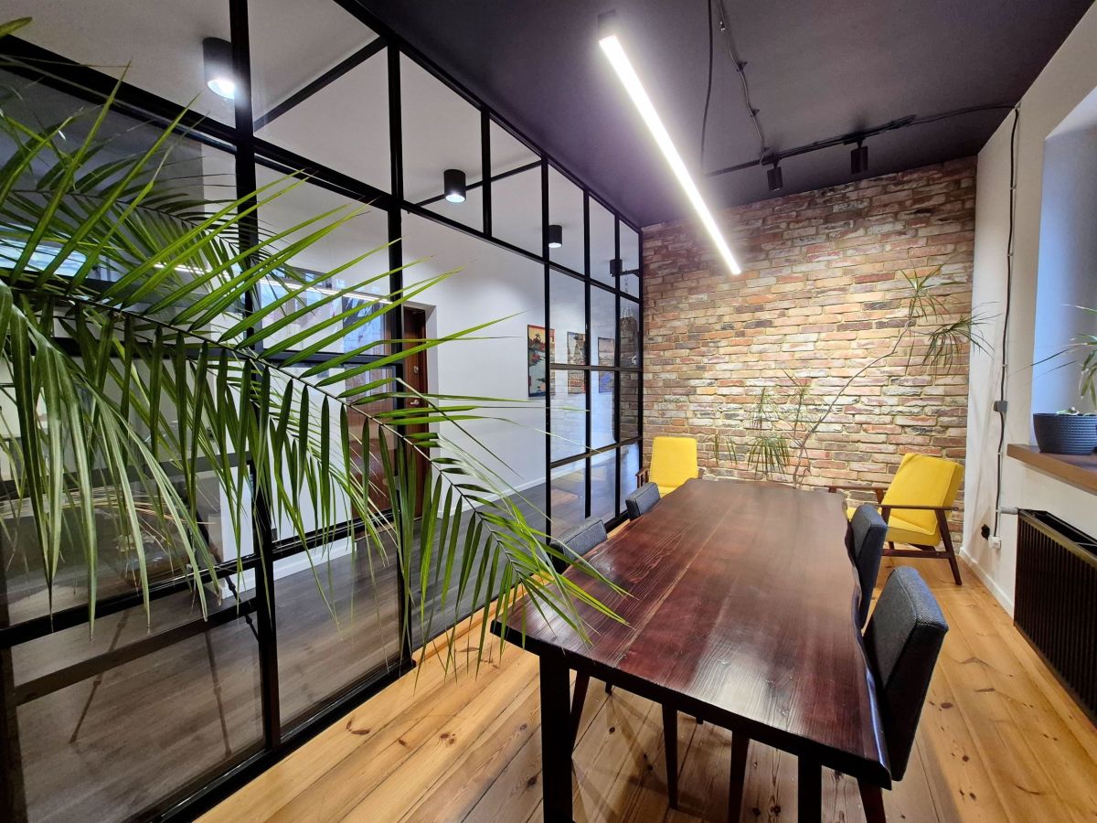 Lokal został wykończony w stylu loftowym, z dbałością o detale podkreślające jego charakter. Wnętrza zdobią oryginalne ceglane ściany oraz efektowne przeszklenia, które dodają przestrzeni lekkości i nowoczesności. Dominują ciemne, eleganckie kolory, tworzące spójny i ponadczasowy klimat. Całość dopełniają duże, drewniane okna, zapewniające doskonałe doświetlenie, oraz oryginalne drewniane deski na podłodze, które wprowadzają naturalne ciepło i podkreślają industrialny styl wnętrza.