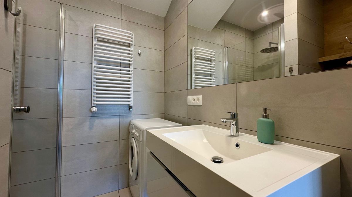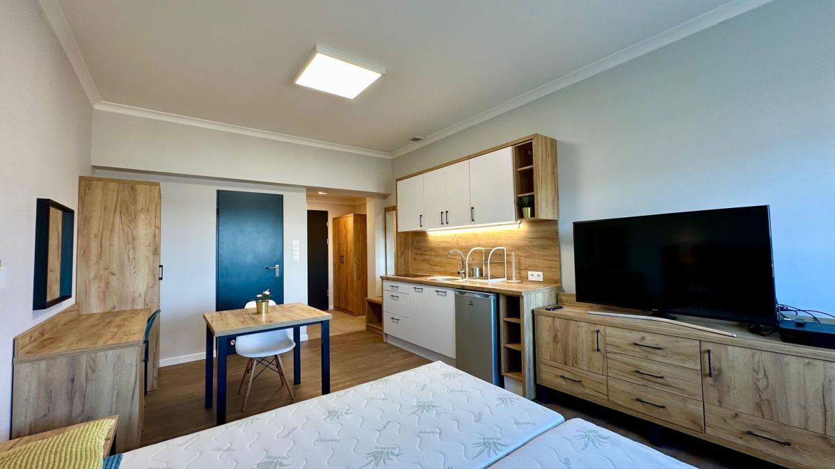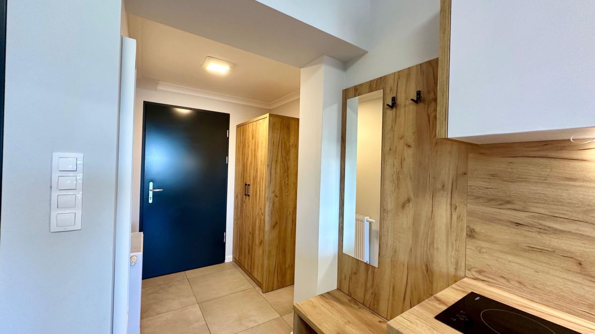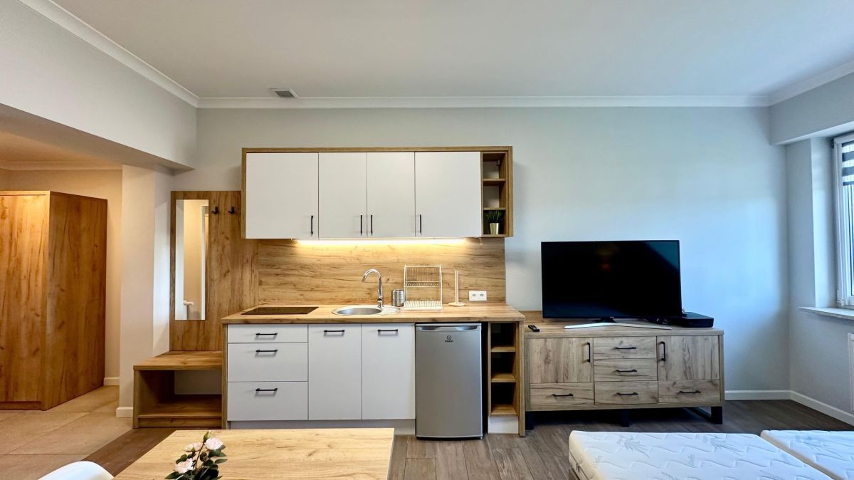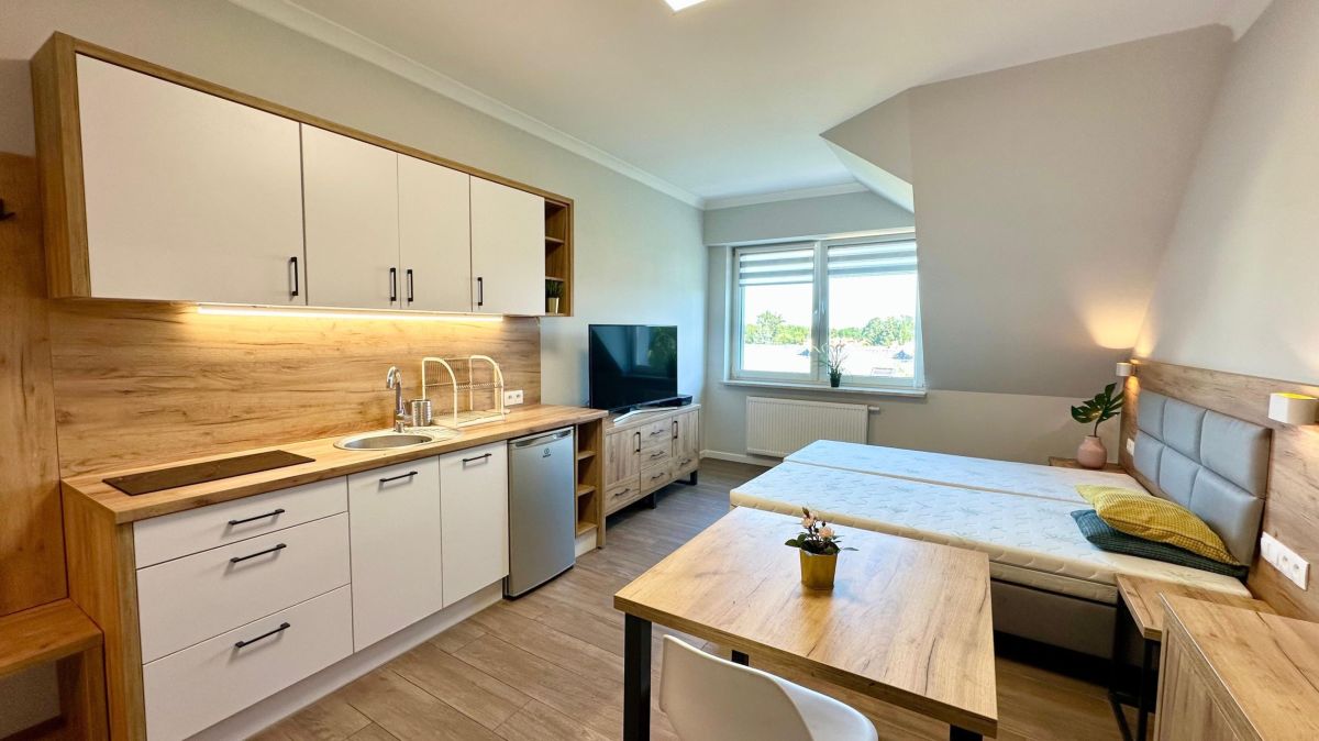 Mieszkanie jest w pełni umeblowane. W salonie duże łóżko dwuosobowe. Aneks kuchenny wyposażony w lodówkę oraz płytę grzewczą. W łazience do dyspozycji pralka.