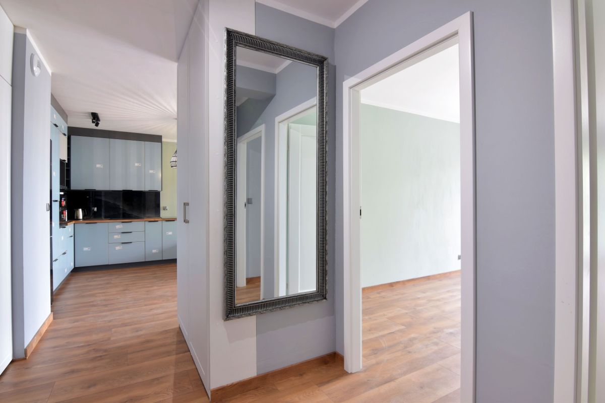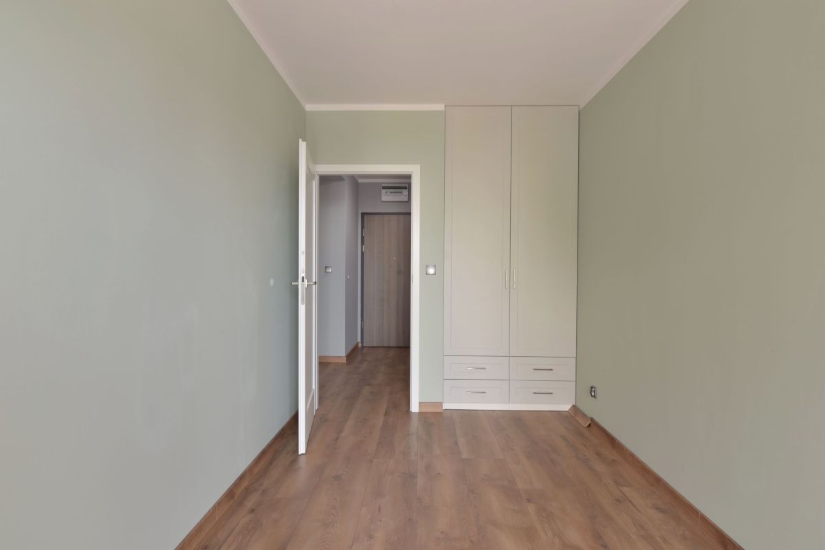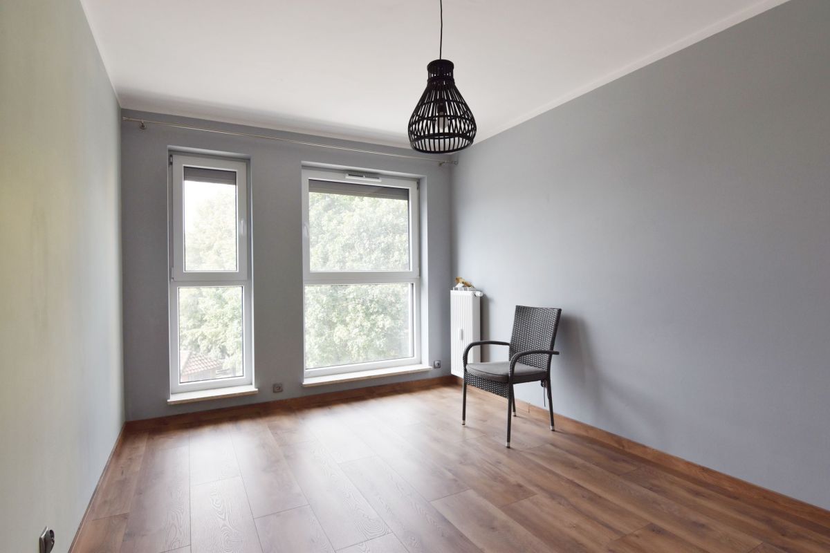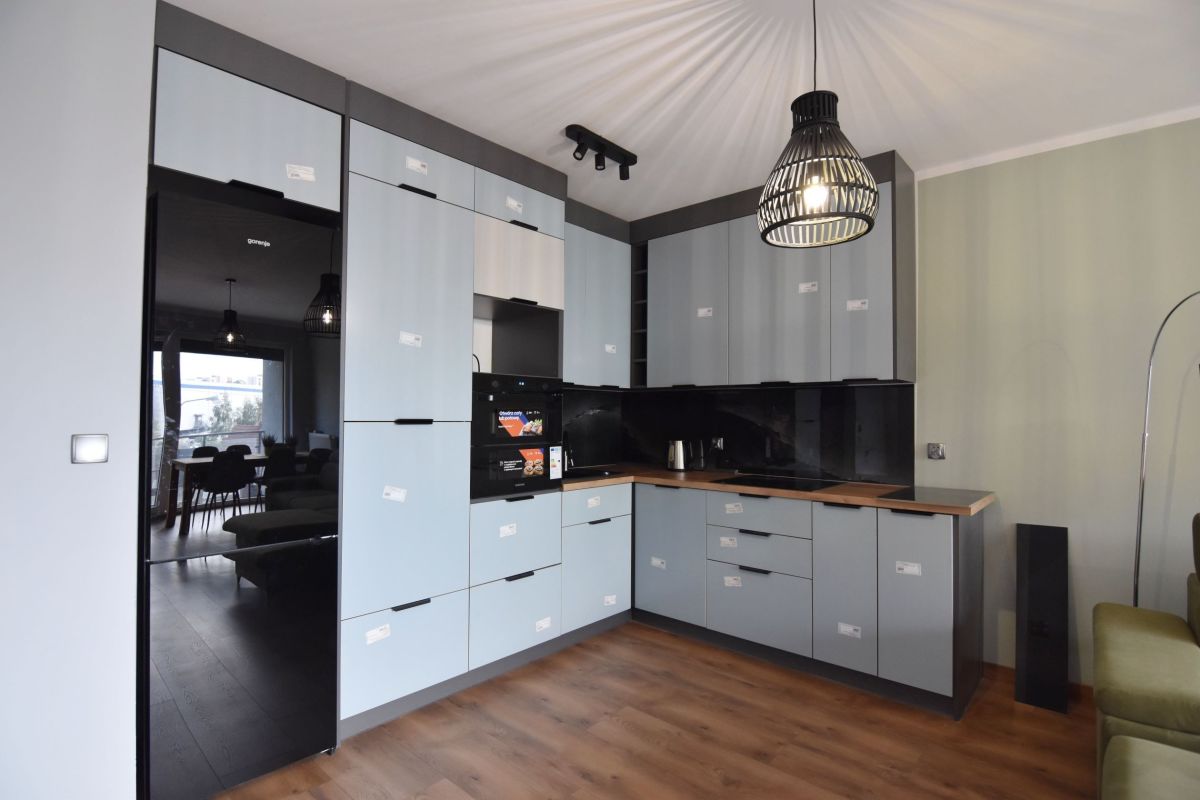 Kuchnia jest w pełni umeblowana i wyposażona w sprzęt agd (zmywarka, płyta indukcyjna, piekarnik, lodówko-zamrażarka, mikrofalówka, pochłaniacz). W salonie znajdziemy rozkładany narożnik, szafkę rtv, komodę, stół z krzesłami. W każdej z sypialni oraz w przedpokoju znajduje się pojemna szafa. W garderobie, do której wejście prowadzi z przedpokoju mamy dodatkowe miejsce do przechowywania. Z jednej z sypialni oraz salonu możemy wyjść na przestronny balkon.