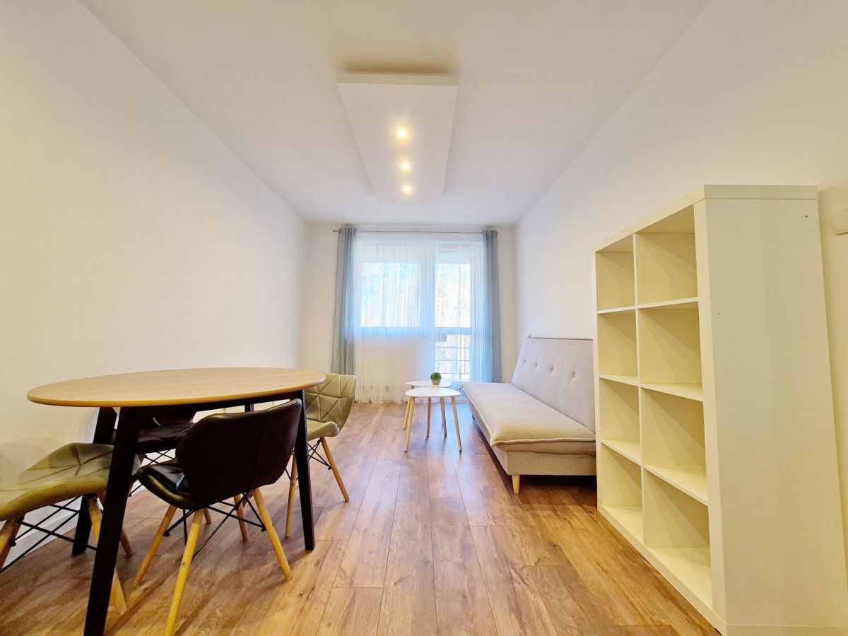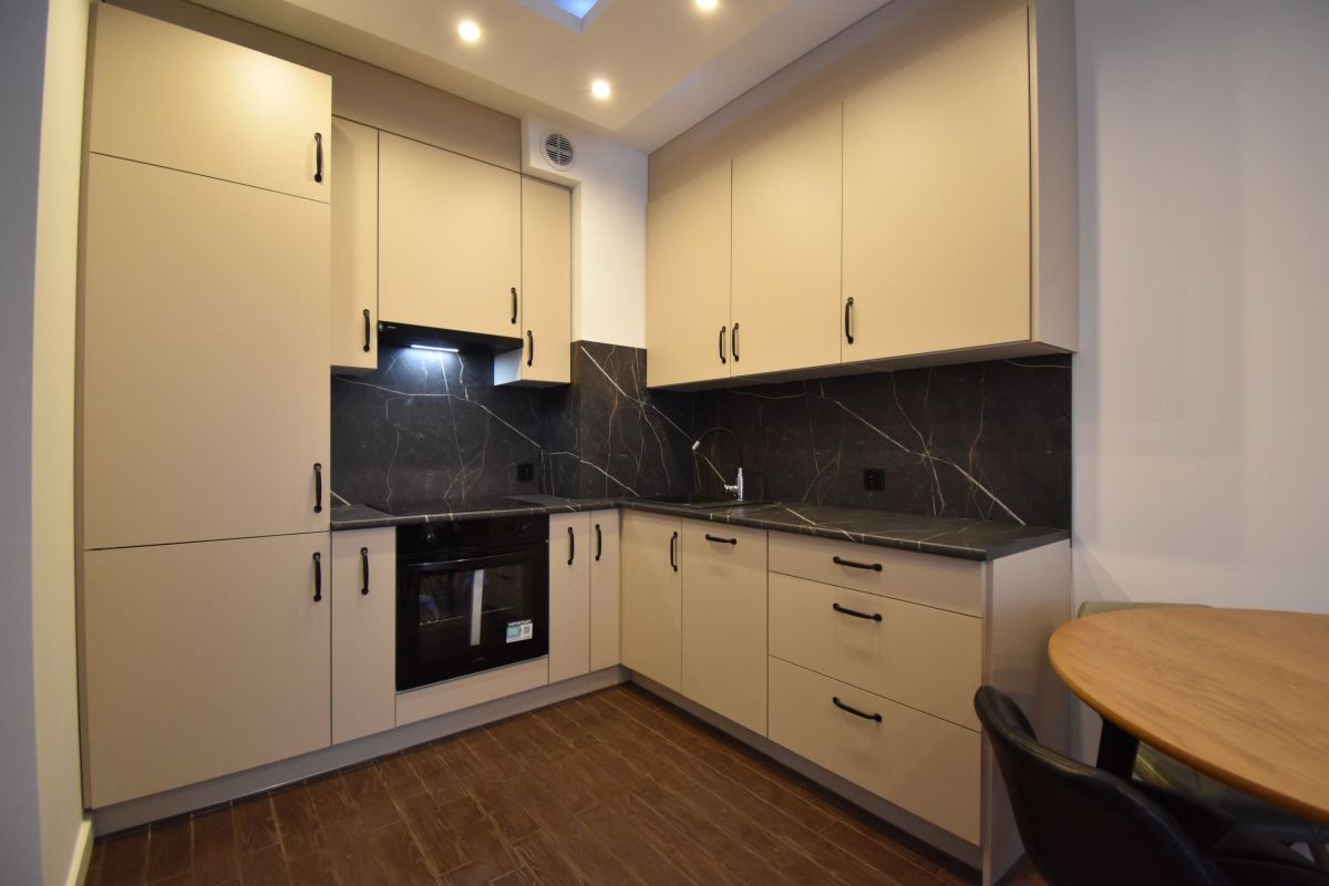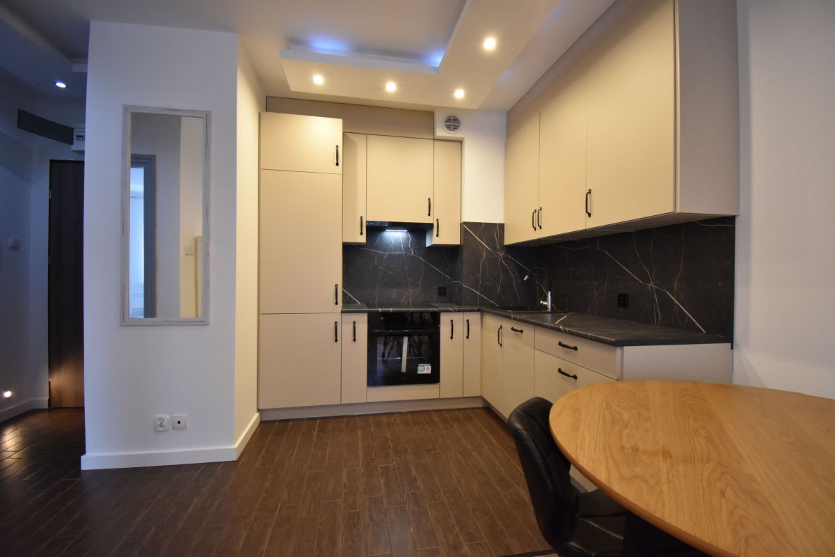 Mieszkanie wynajmowane jest z umeblowaniem i wyposażeniem widocznym na zdjęciach. Kuchnia wyposażona w sprzęt agd: zmywarka, płyta elektryczna, lodówka, pochłaniacz.