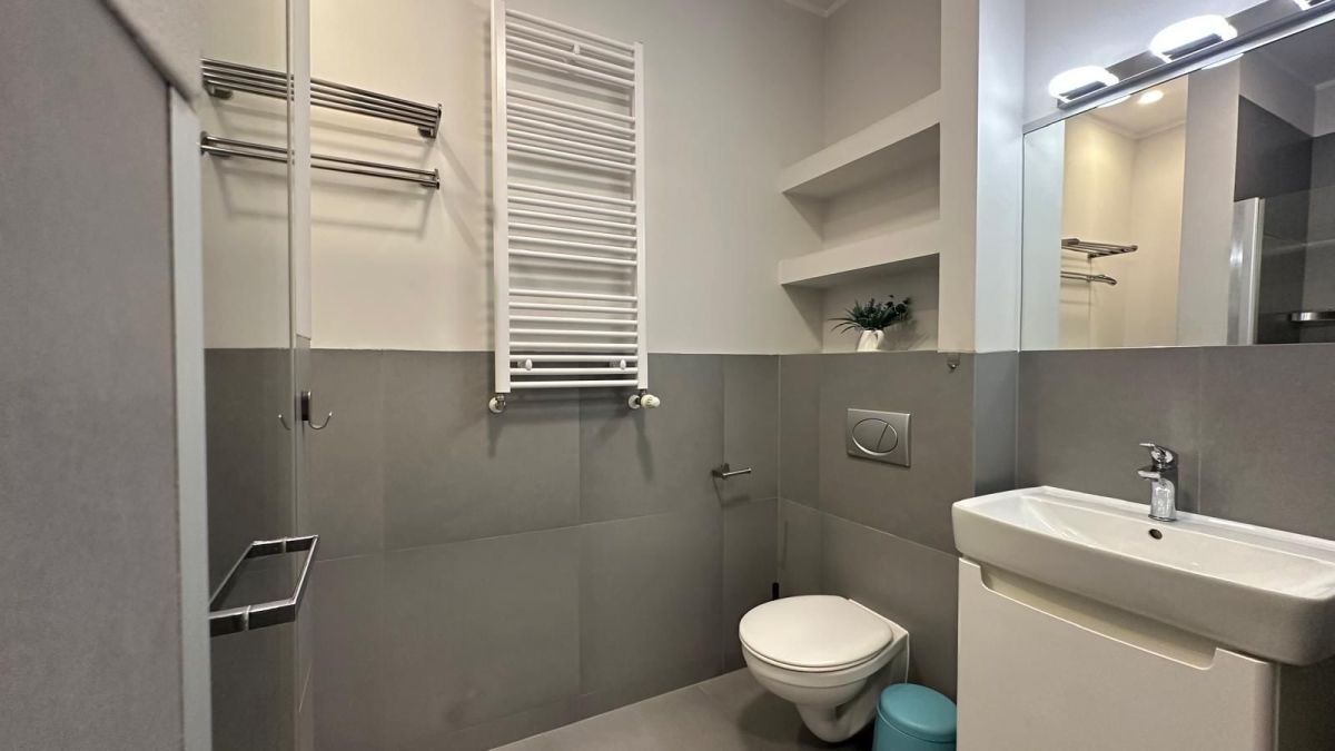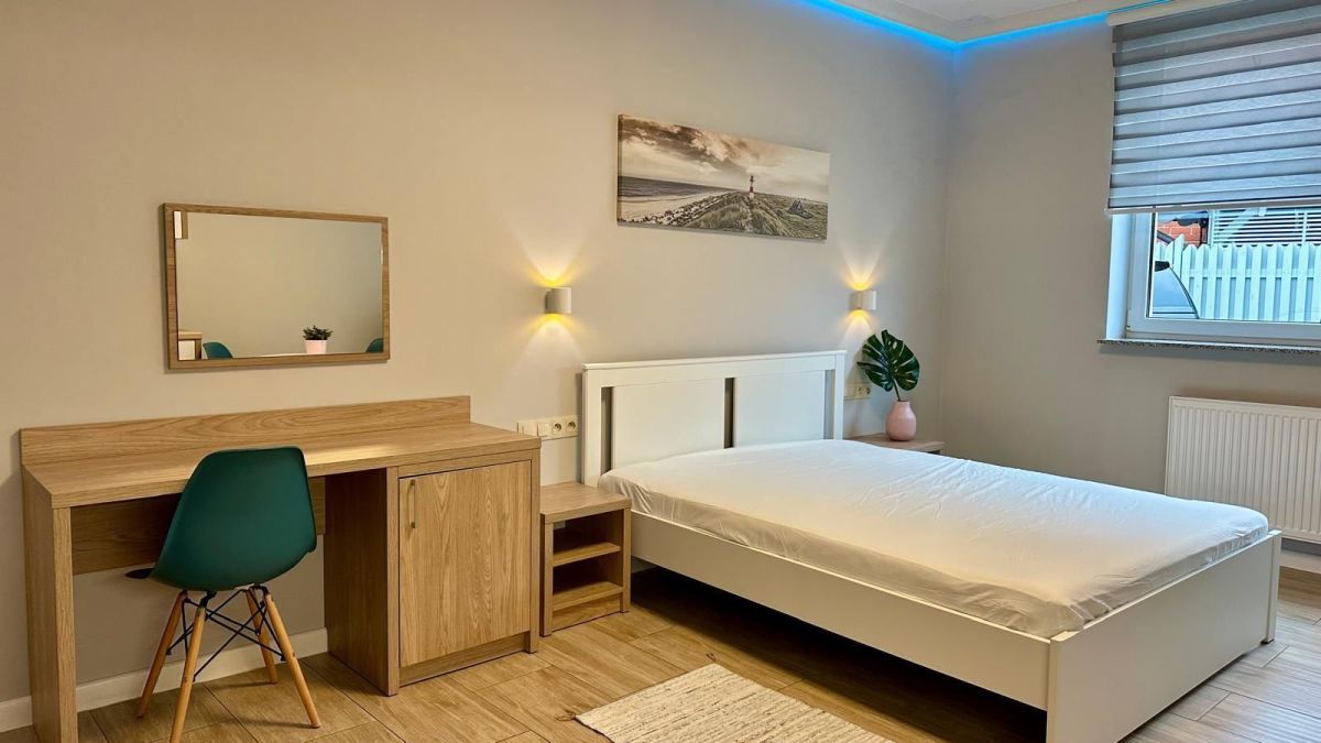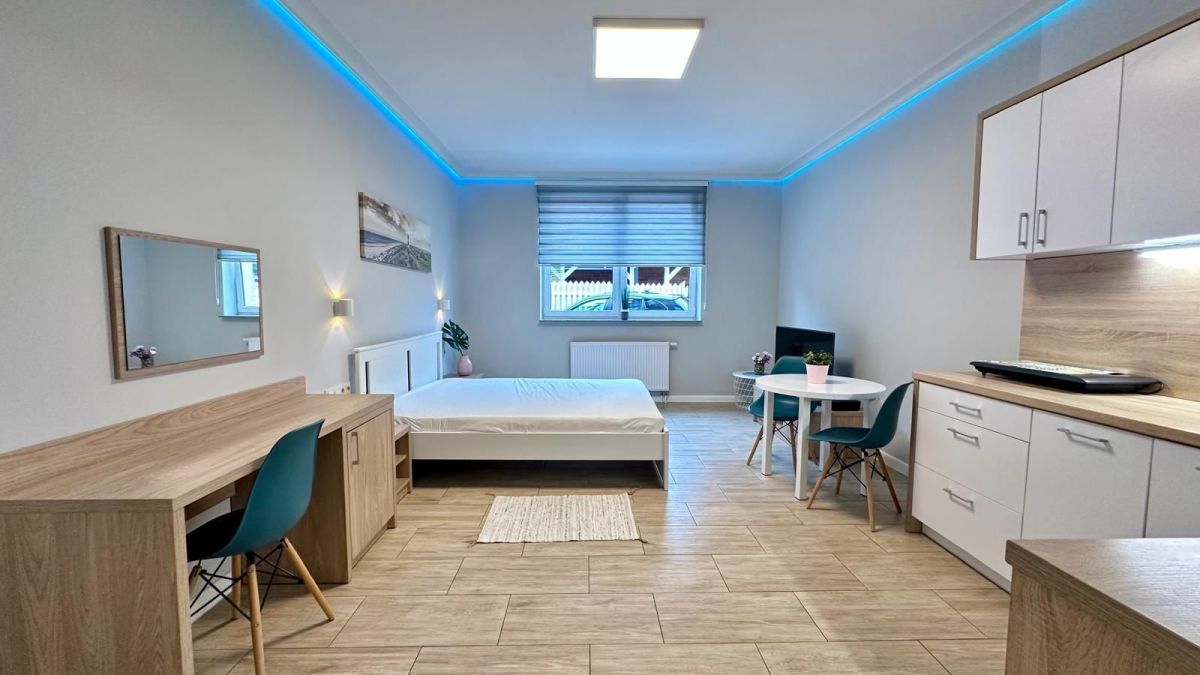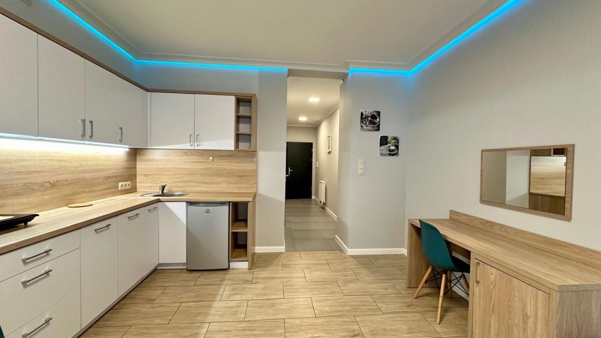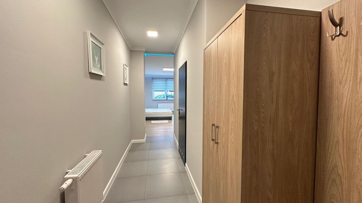 Mieszkanie jest w pełni umeblowane. W salonie duże łóżko dwuosobowe. Aneks kuchenny wyposażony w lodówkę oraz płytę grzewczą. W łazience pralka.