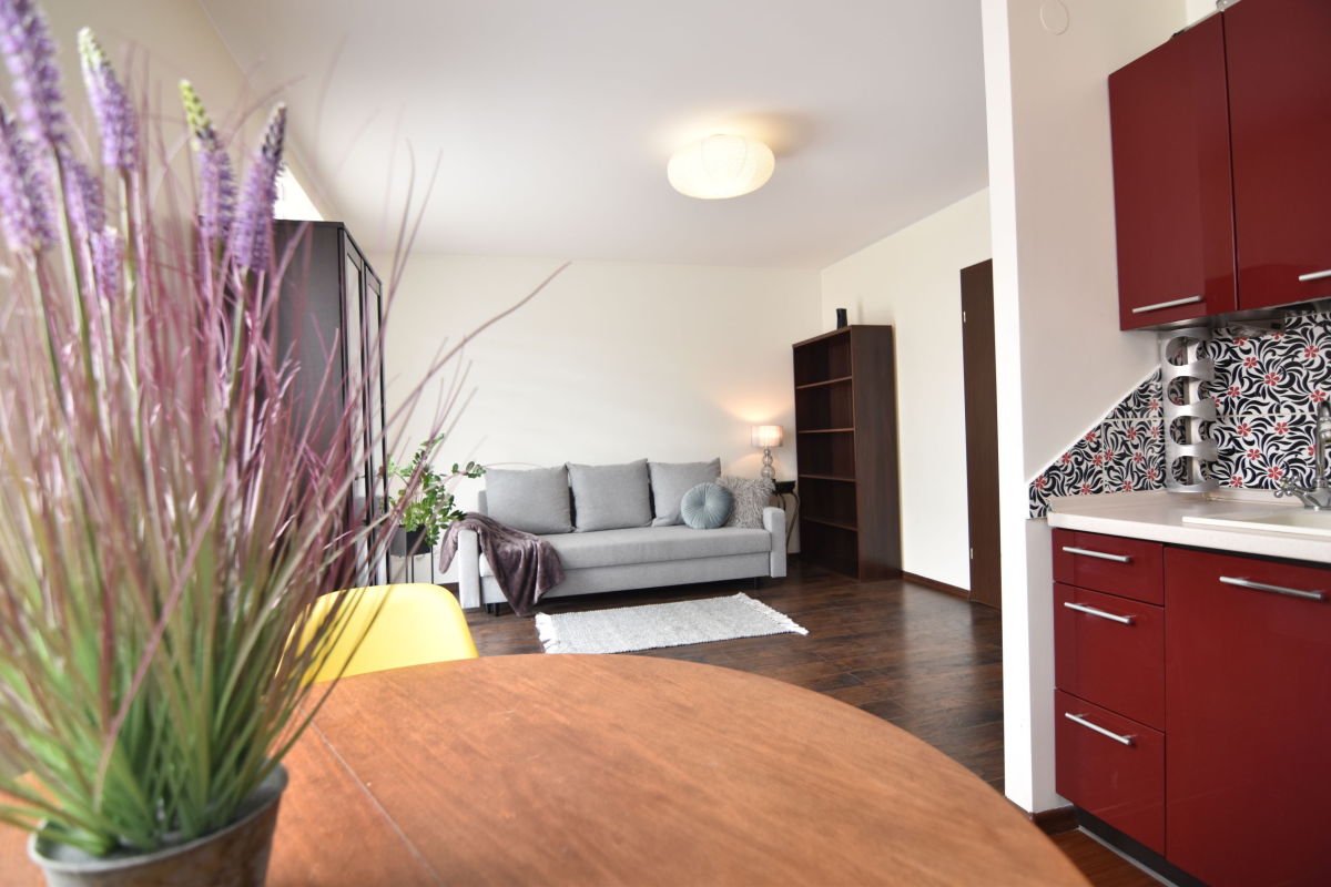 Powierzchnia wynosi 28 m2 i składa się na nią pokój z aneksem kuchennym i z wyjściem na balkon, łazienka z kabiną prysznicową i z wc oraz przedpokój z pojemną garderobą.