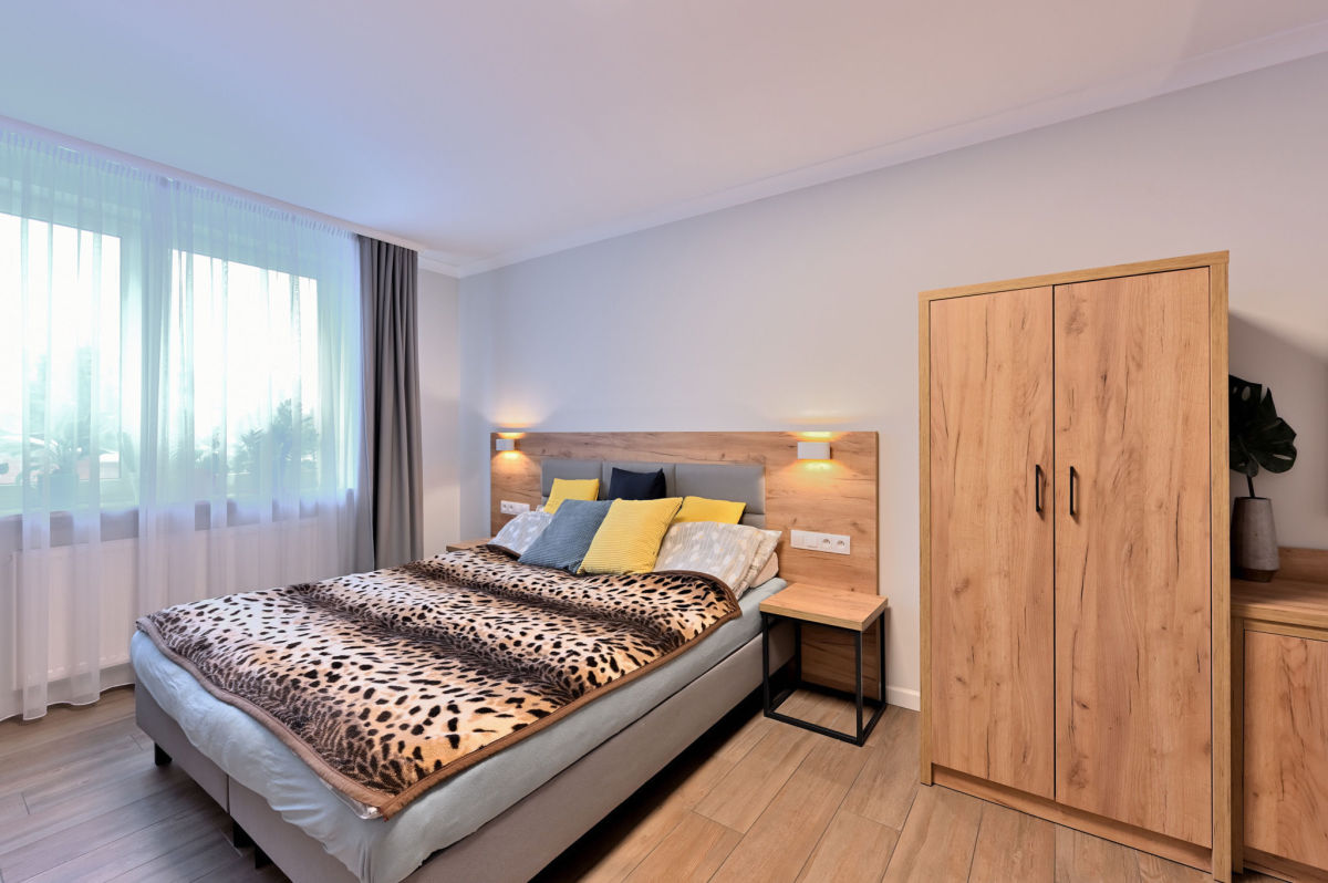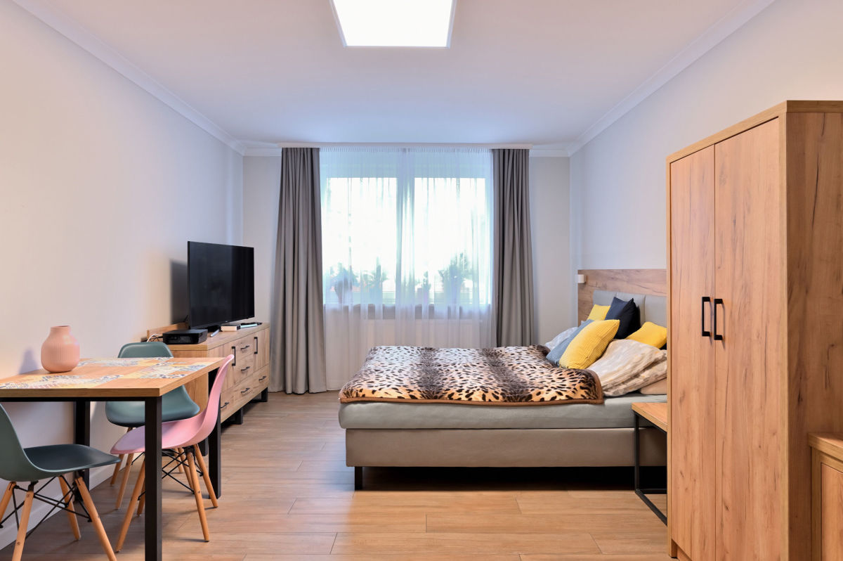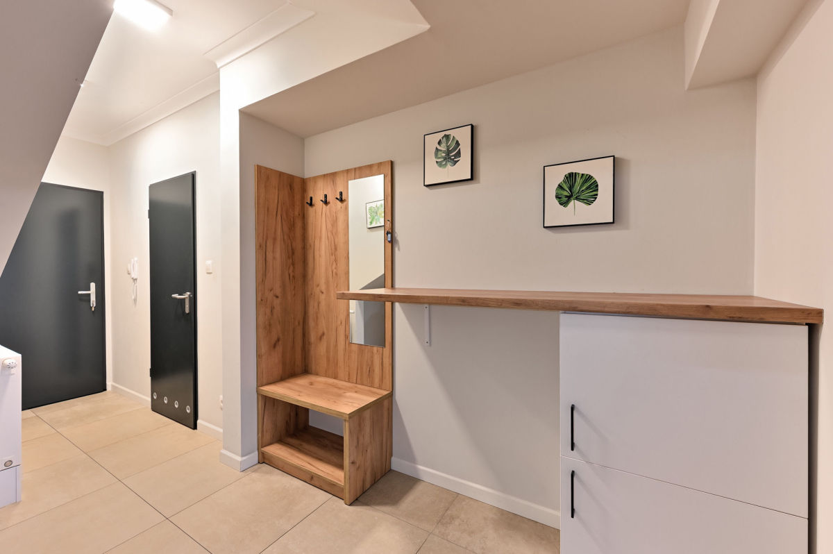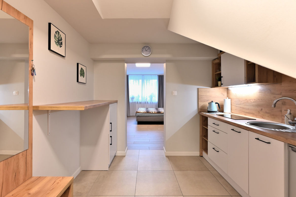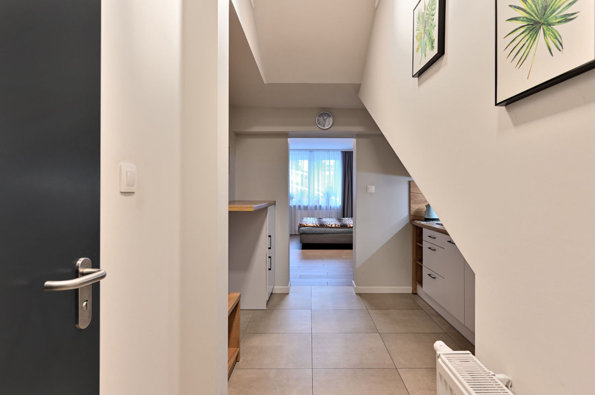 Mieszkanie jest w pełni umeblowane. W salonie duże łóżko dwuosobowe. Aneks kuchenny wyposażony w lodówkę oraz płytę grzewczą. W łazience do dyspozycji pralka.